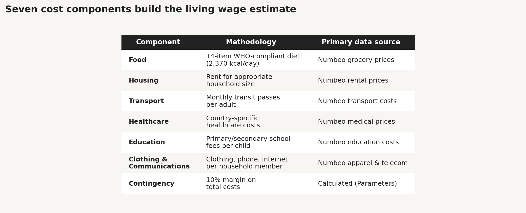 The cost-of-living model now follows the Anker and Anker (2017) framework, which is the most widely accepted standard for living wage estimation. It builds a household budget from seven cost components: food, housing, transport, healthcare, education, clothing and communications, and a contingency margin. Each component is priced using Numbeo’s crowdsourced cost-of-living data for 101 countries and 188 cities, cross-referenced against World Bank indicators for taxes, unemployment, fertility rates, and purchasing power parity.
