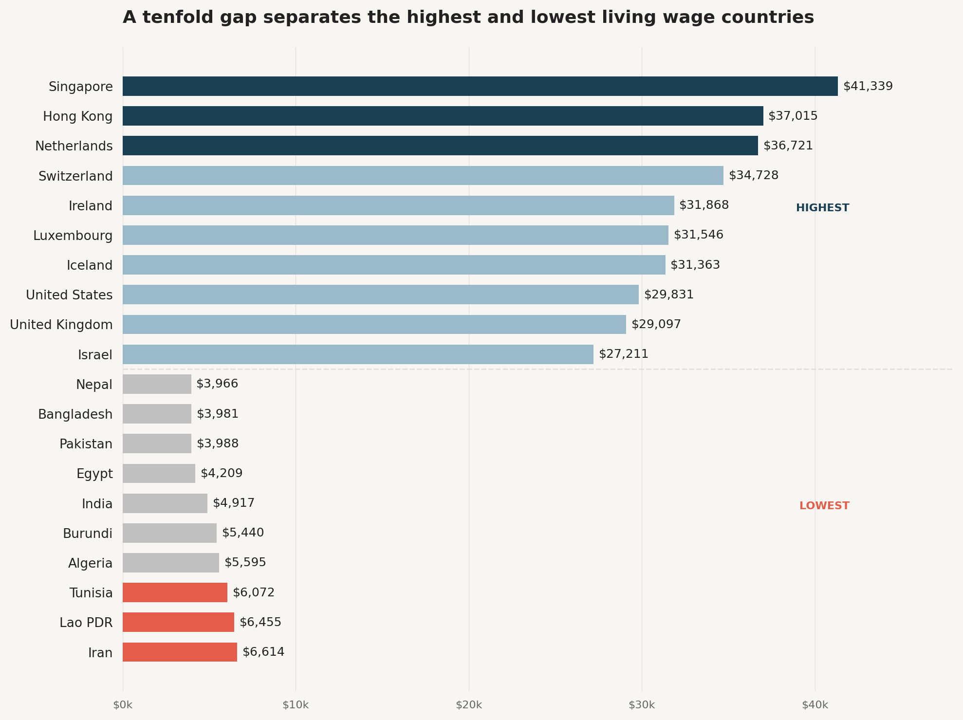 The range is enormous. Nepal sits at the bottom with $3,966 per year, while Singapore tops the list at $41,339. That is a ratio of more than ten to one. Five countries (Singapore, Hong Kong, the Netherlands, Bermuda, and Switzerland) require annual household earnings above $35,000 to meet a basic living standard. At the other end, five countries (India, Egypt, Pakistan, Bangladesh, and Nepal) fall below $5,500.
