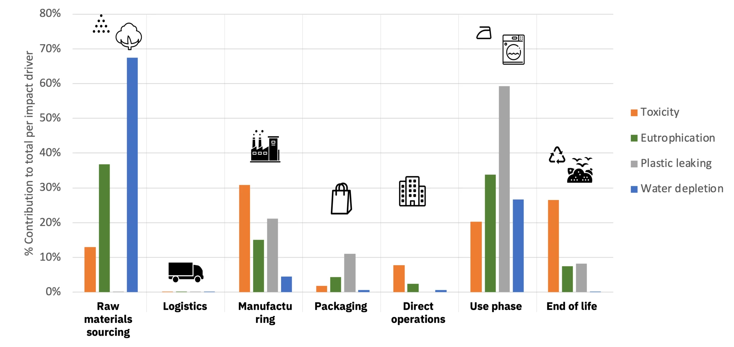 We analyzed their comprehensive water footprint, covering water eutrophication, toxicity, depletion, and plastic leakage into waterways and oceans. This analysis included microplastics, macroplastics, plastic pellets, and tire wear associated with logistics, covering every step from raw materials and manufacturing to product use and end-of-life disposal.
