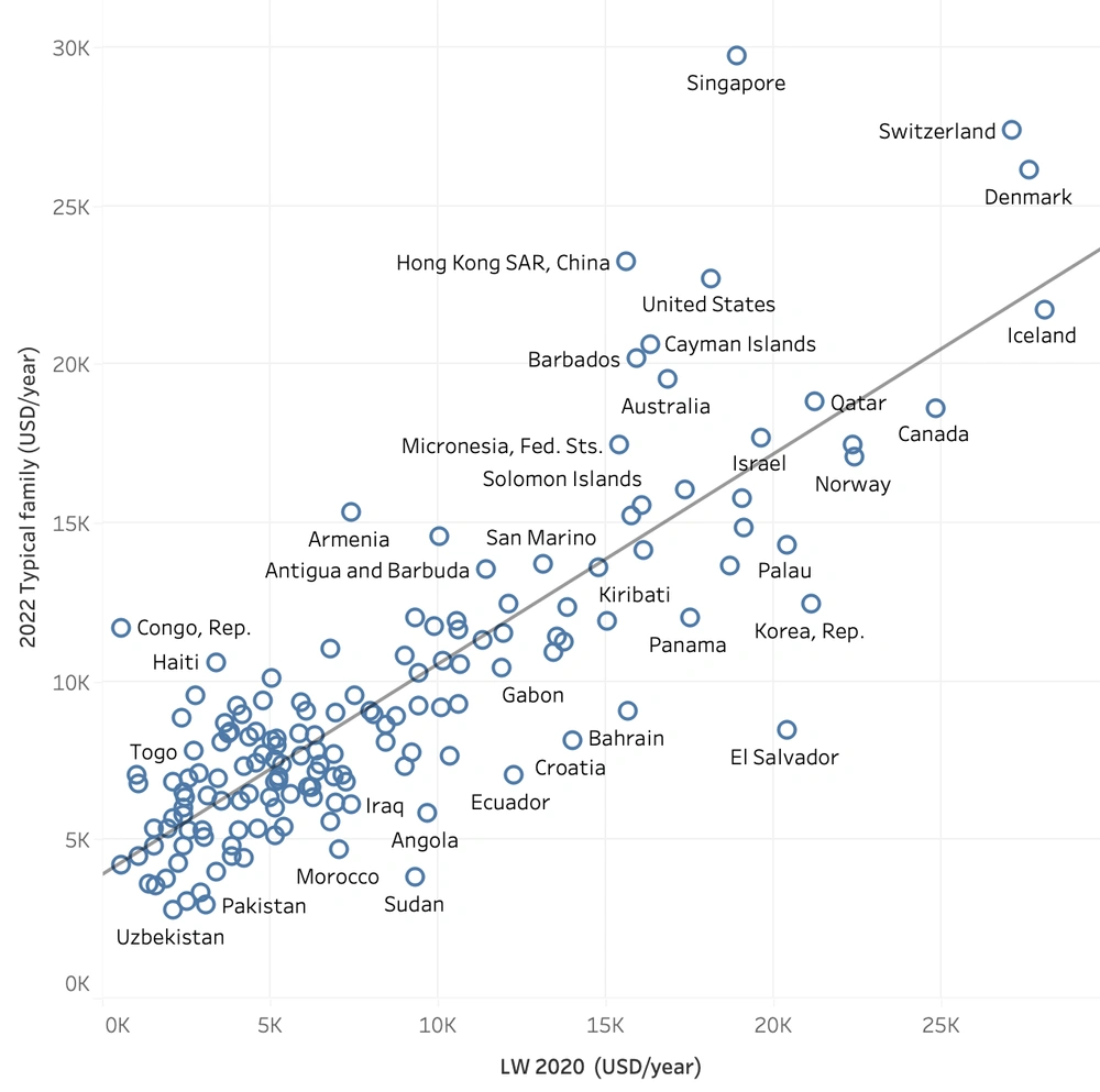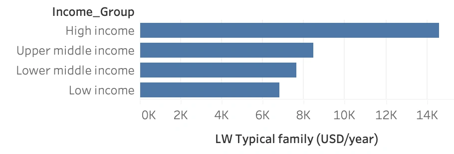 The type of economy and income group classification of countries (using the World Bank classification) is a good predictor of the value of the living wage. In general, cost of living is relatively correlated to price and income levels.