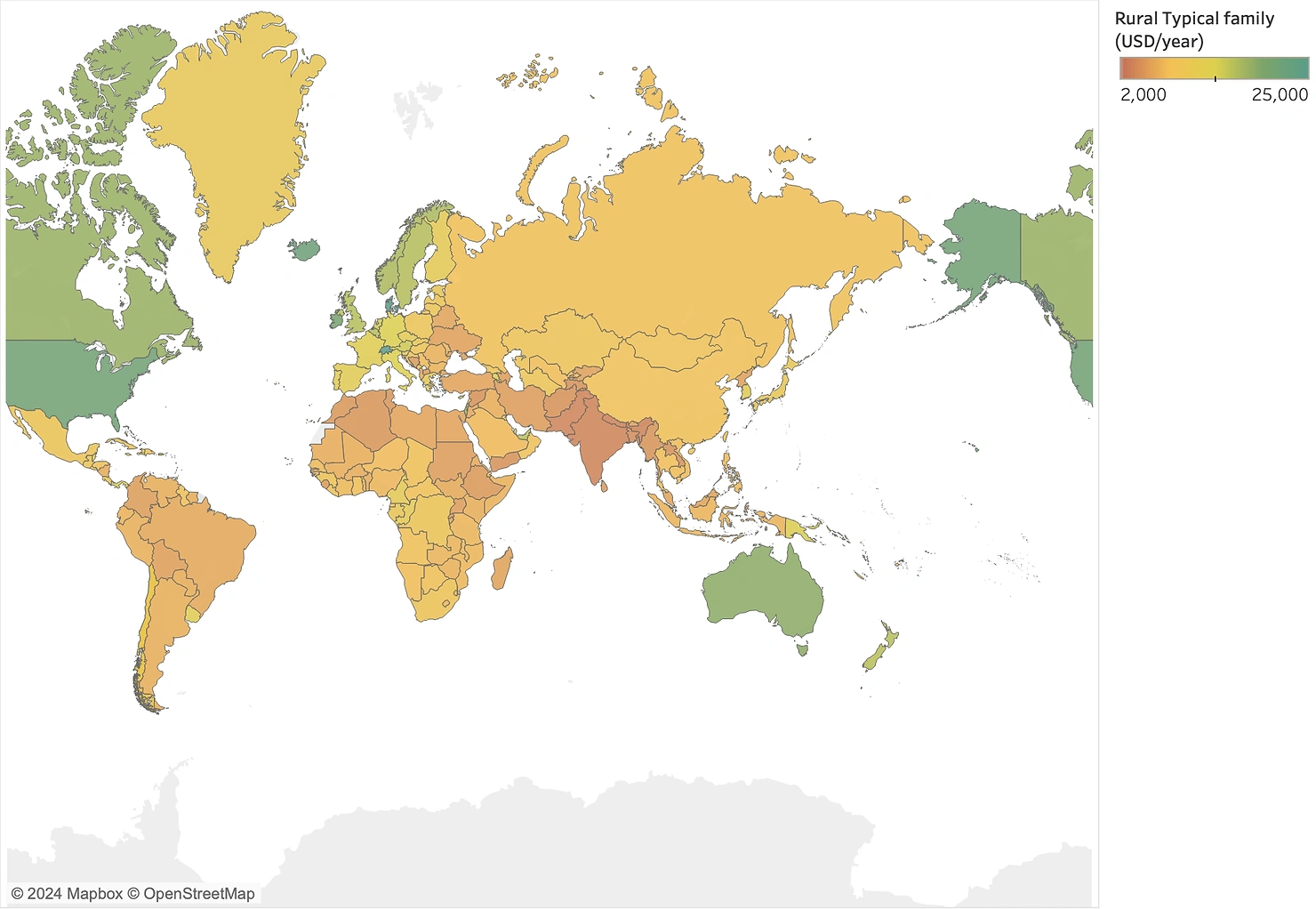 The next figures shows the Global Living Wage Dataset, its high coverage and an idea of the range of living wage (typical family) for each country.