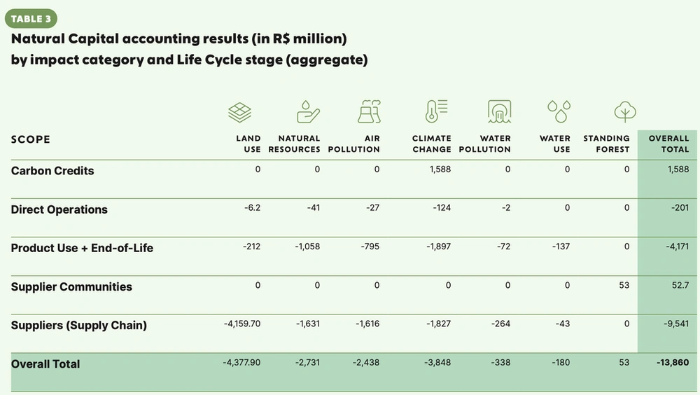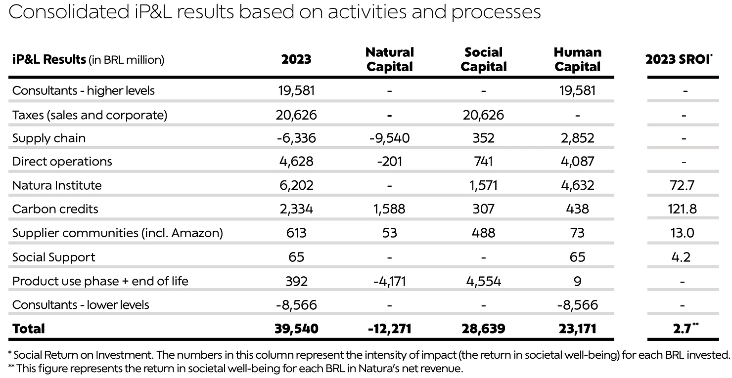 Natura results shown below can be split per main activity along its value chain and across categories of impact drivers (aggregated for the purpose of the communication). The key value of this approach is also its capacity to not only measure the negative environmental impact, but also the change of practices and investment in regenerative practices and businesses as illustrated through the results lines of carbon credits and supplier communities. We assessed as well a range of positive impact generated by products’ innovations for specific brands of Natura, or the value of a recycling and material circularity program, among other program. These assessment support the development of a regenerative business model which can be measured through the objective results of an IP&L to achieve the target of delivering $4 of value for each $1 of revenue.