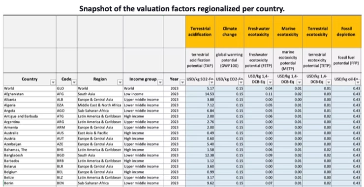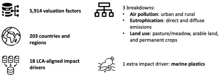 This new version of the valuation factors covers 5,916 data points across 204 countries and regions, and across 18 impact drivers aligned with Life Cycle Assessment (LCA) method ReCiPe.