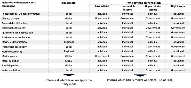 The question we are aiming to answer is who bear the cost of this change of natural capital and how does it change the well-being locally in our society? Depending on who we expect to pay for those economic costs (individual or government, depending in part on the level of income of a country, and depending on the geographical reach of the impact, at local, regional, or global level), different valuation factors are selected among the Health Utility of Income and Taxes (HUI and HUT). Those latter express a change of economic value into a change of well-being, depending on the main stakeholder group that bears the cost (individual vs. government).