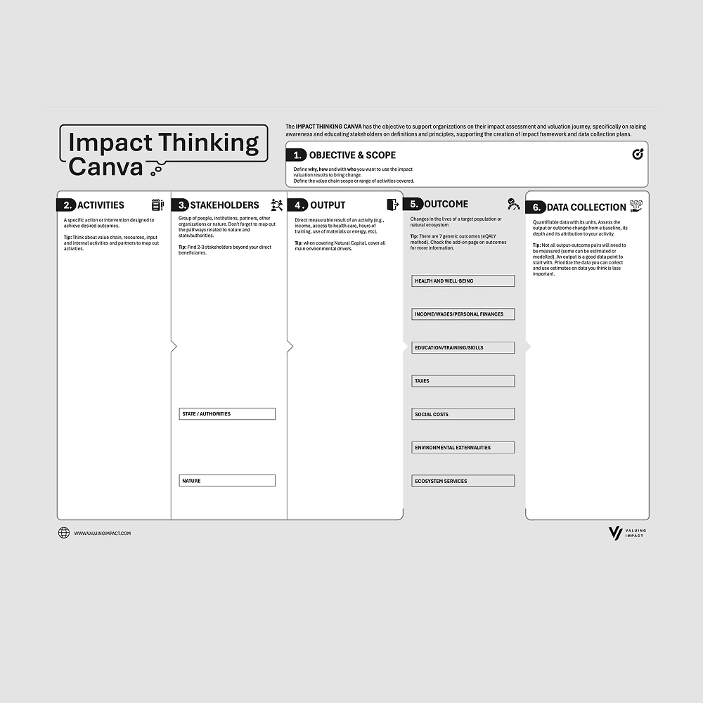 The download embeds Valuing Impact’s standard tool template covering its 7 primary outcome methodologies and embeds a series of value factors and datasets. The value factors cover 19 impact drivers, regionalized for water and land use.
