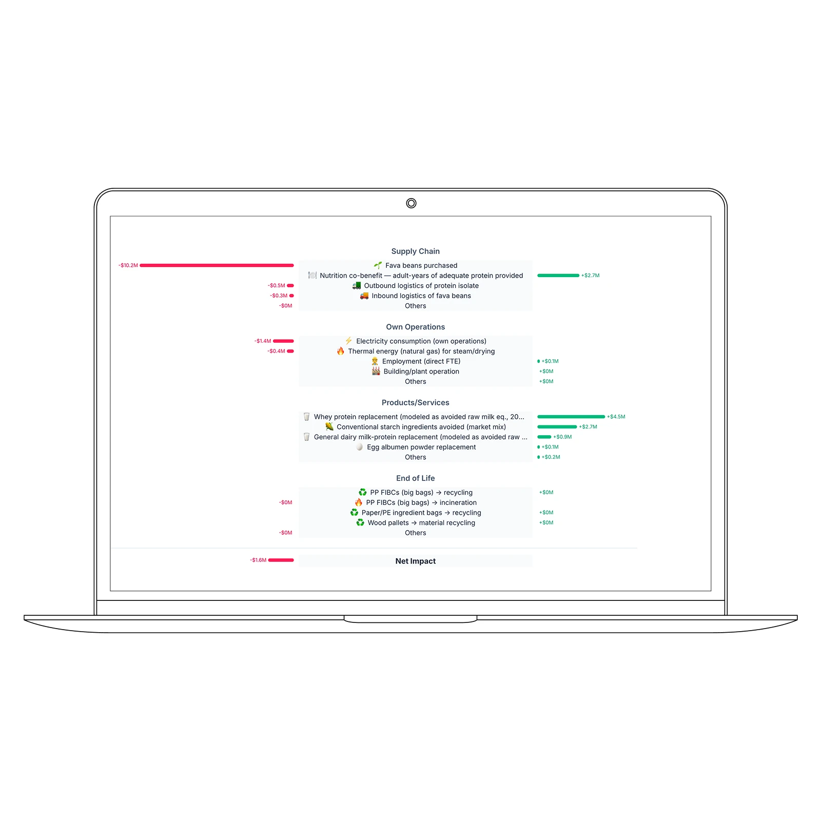 Instant, unlimited impact valuation. From an organization name to an impact statement in minutes. AI-automated workflow, fully custom made based, enriched with any extra user input. Inform screening and due diligence decisions at scale with the the best insights from impact accounting.