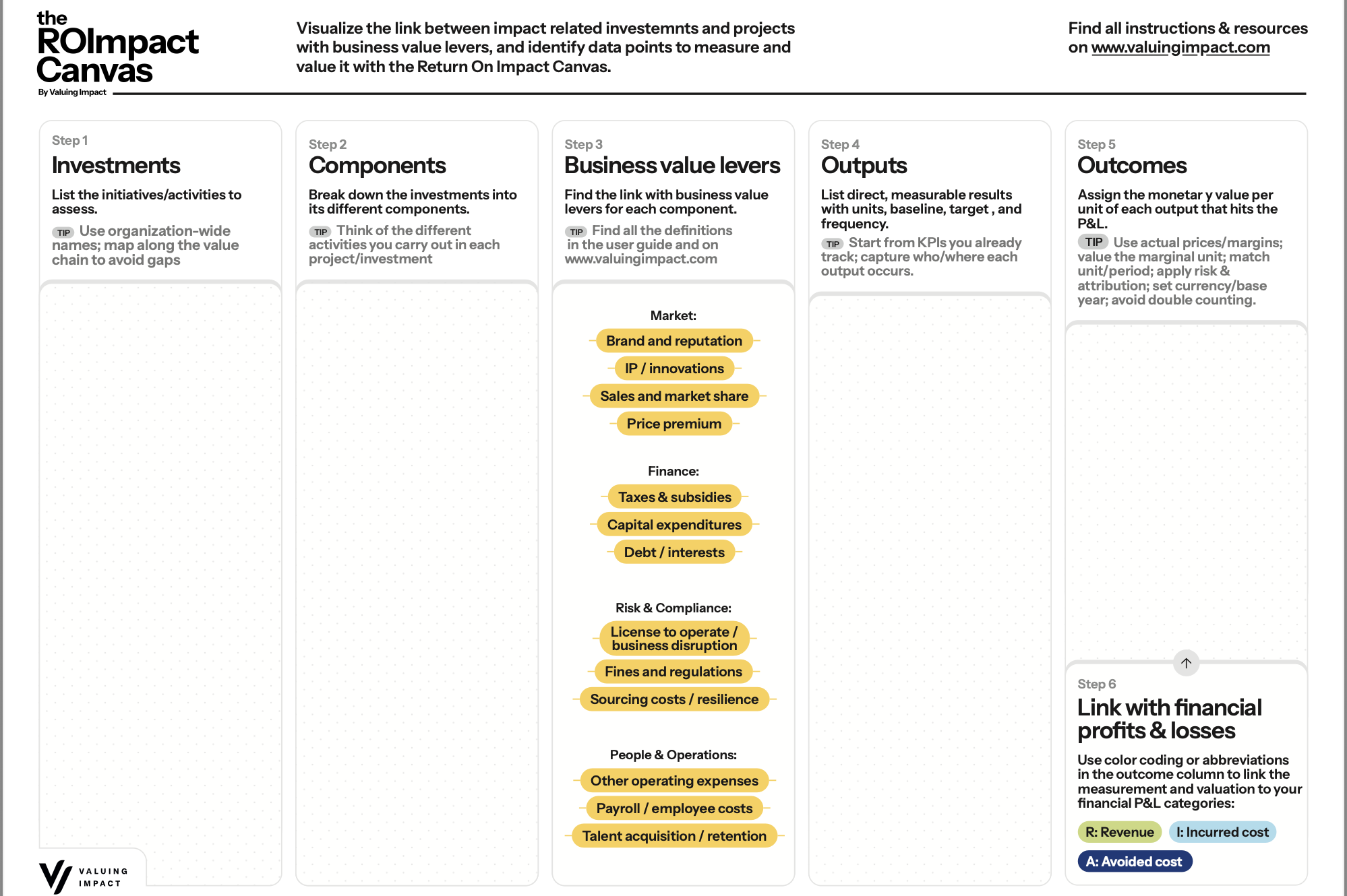 Turn sustainability into business results. The ROImpact Canvas connects ESG initiatives directly to your P&L with one clear method.