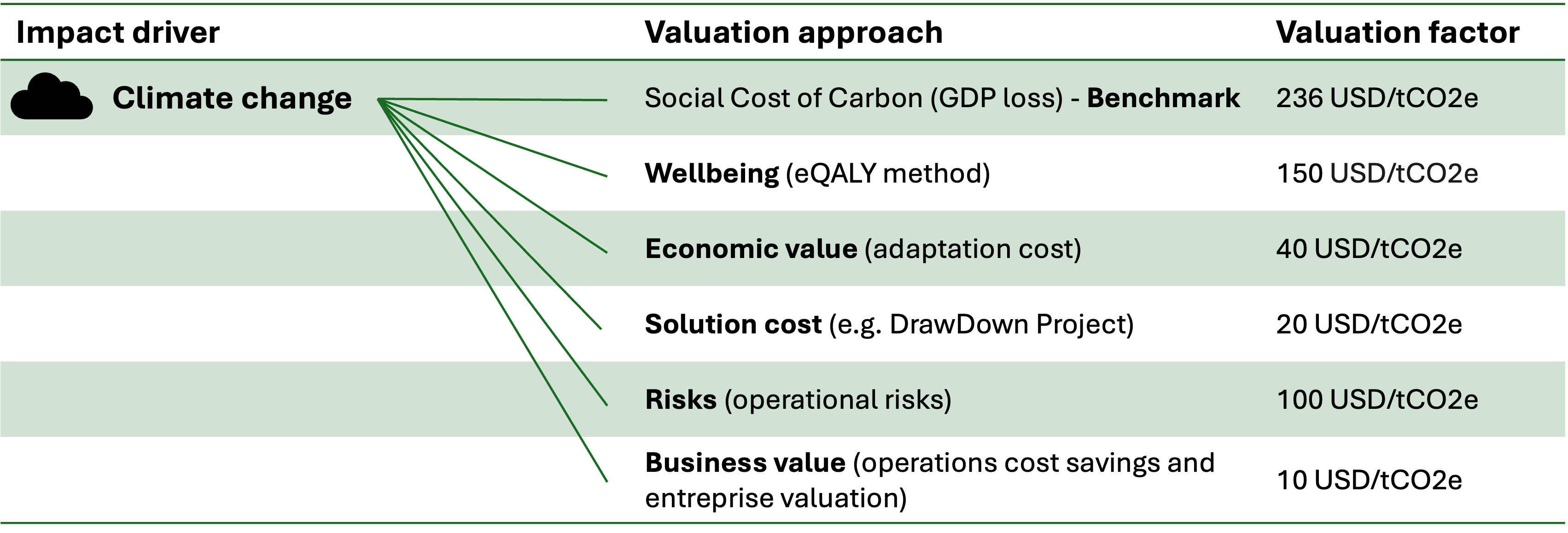 The figure below shows the different valuation perspectives applied to the climate change impact driver. We added as benchmark the traditional Social Cost of Carbon. We realized that we obtain very different answers depending on the value perspective that we chose. In addition to those, climate change can be further valued in terms of taxes, willingness to pay from consumers or population, market prices (for instance, carbon credits), and more.  The possible perspectives are infinite, although the one we chose for our methodologies relies on the key decision-making questions above.